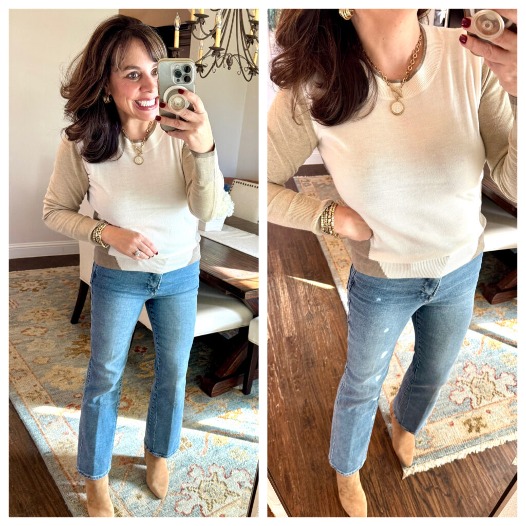 luxe colorblock sweater / crop bootcut jeans / suede booties / chunky hoop earrings / coin toggle necklace / matte gold bracelet stack
