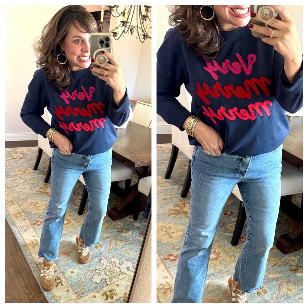 And how about this Very Merry sweatshirt. The word DARLING comes to mind, right? I like that it’s fun and festive, but it’s not over the top. The color combo with navy, pink, and red is fresh and super cute. For size reference, I’m wearing a medium.