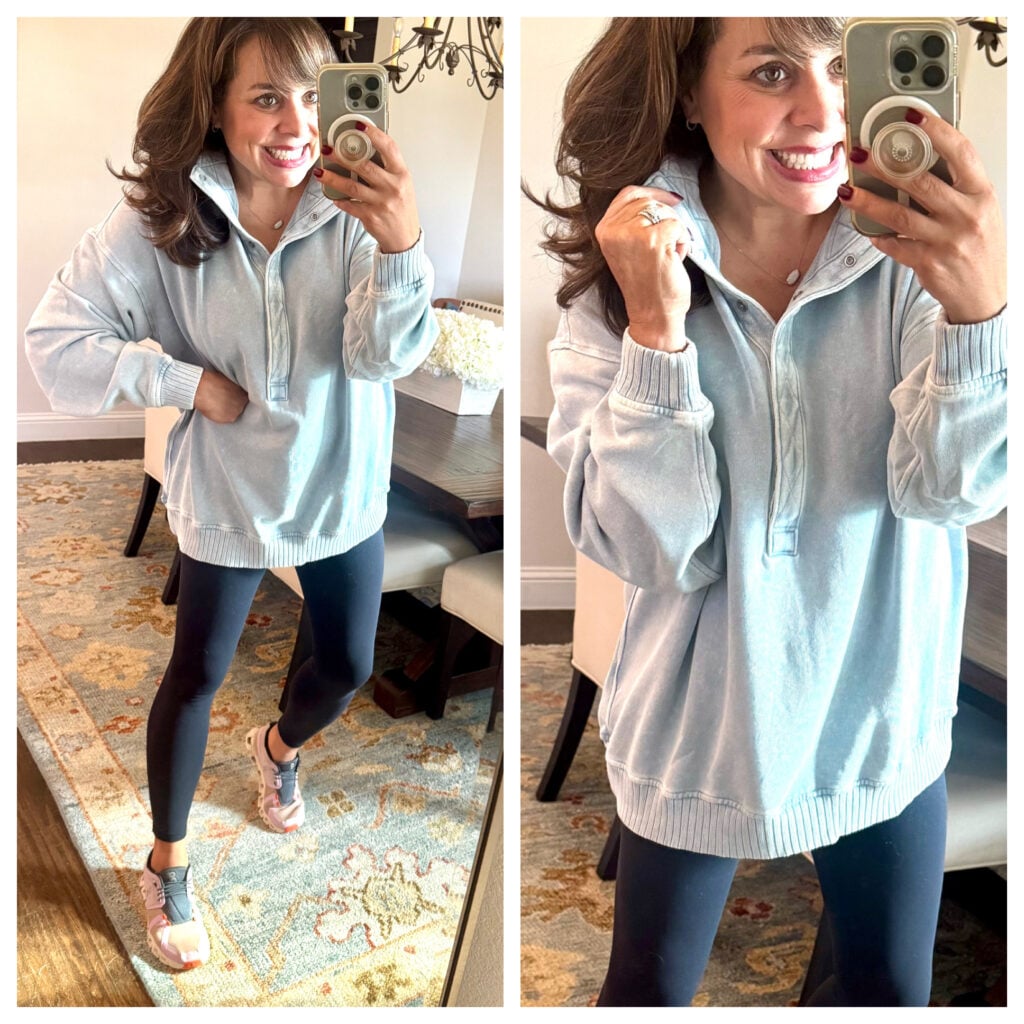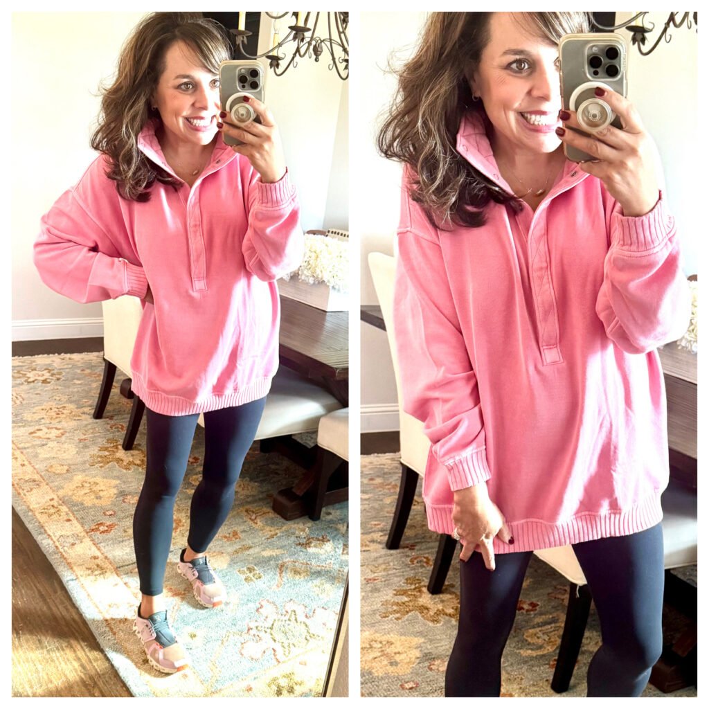 I wore this exact outfit all day Wednesday and all day Thursday around the house, and I’m not sure if I’ve ever been happier because OHHHHHHHMYYYYYYYYYY is it comfy. I’m wearing an x-small in the sweatshirt and the sweatpants. I do think the sweatpants are a little short on me (I’m 5’4″ with long legs and no torso), but I think the smalls would have been too oversized. So my suggestion would be to size down 1 to 2 sizes in the sweatshirt (I sized down 2) and size down probably 1 size in the pants because they are quite roomy.