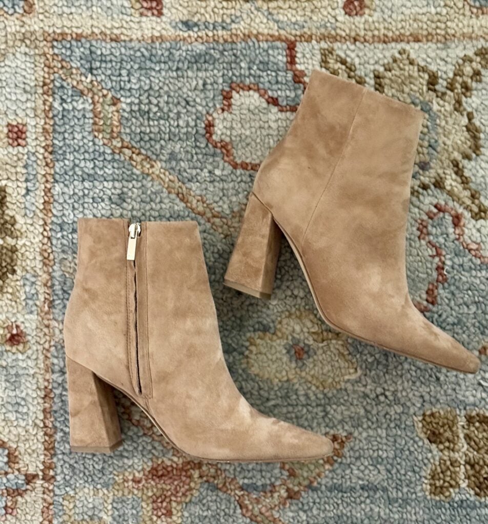 They are a beautiful neutral (these are the “light neutral”), and I’m happy to have them in suede, but they do come in some leather options too. They have a sleek look, clean lines, a square toe, and a tapered block heel. I love them so much.