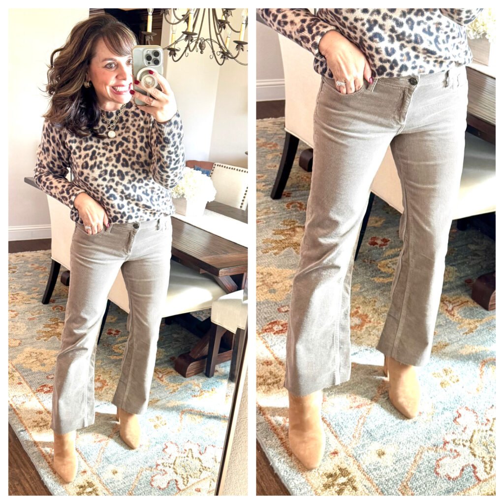 These ankle flare cords have a perfect amount of stretch in them to make them both comfy and flattering (while not stretching out too much during the day). The length makes them great for booties, fashion sneakers, mules, flats, and Mary Jane’s. The color you see below is called “Rosemary”, but I just think of them as a really pretty neutral. I’m wearing my regular size 4.