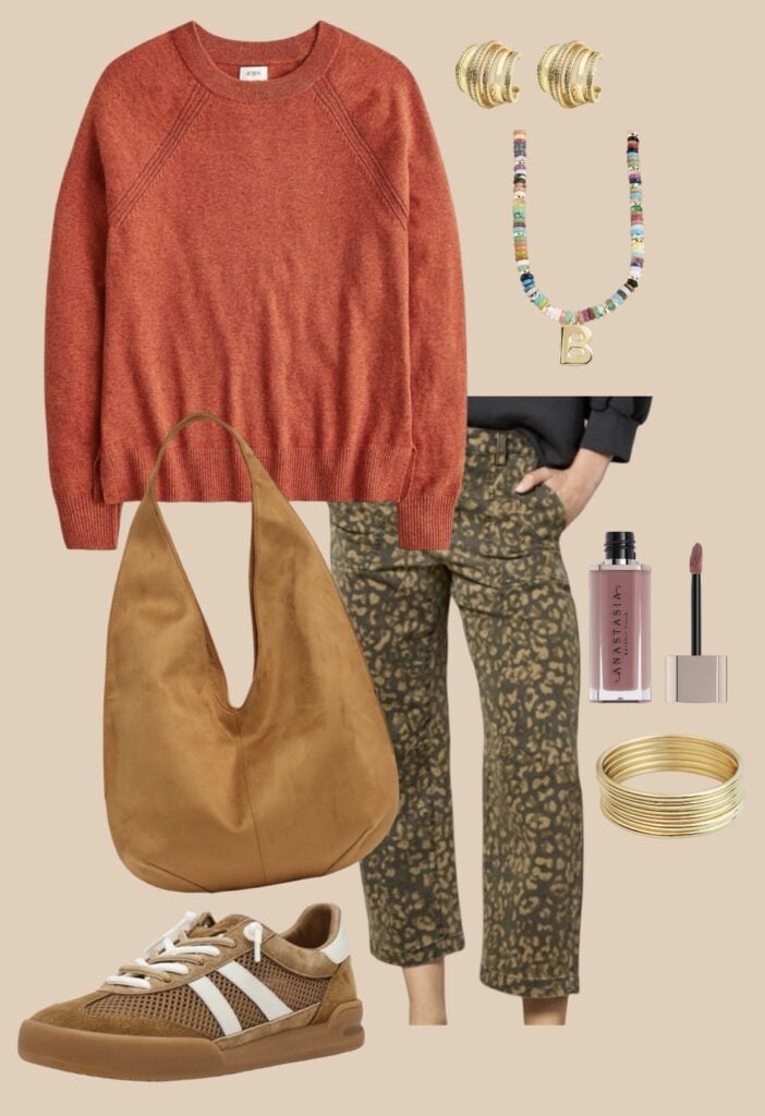 rust sweater / leopard barrel jeans / earrings / necklace / suede hobo bag / Steve Madden sneakers / gold bangle set / lip velvet liquid lipstick