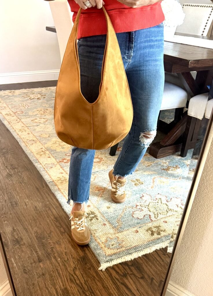 orange sweatshirt / non-distressed version of jeans / suede hobo bag / Steve Madden sneakers / skinny hoops / toggle necklace / matte gold bracelet stack