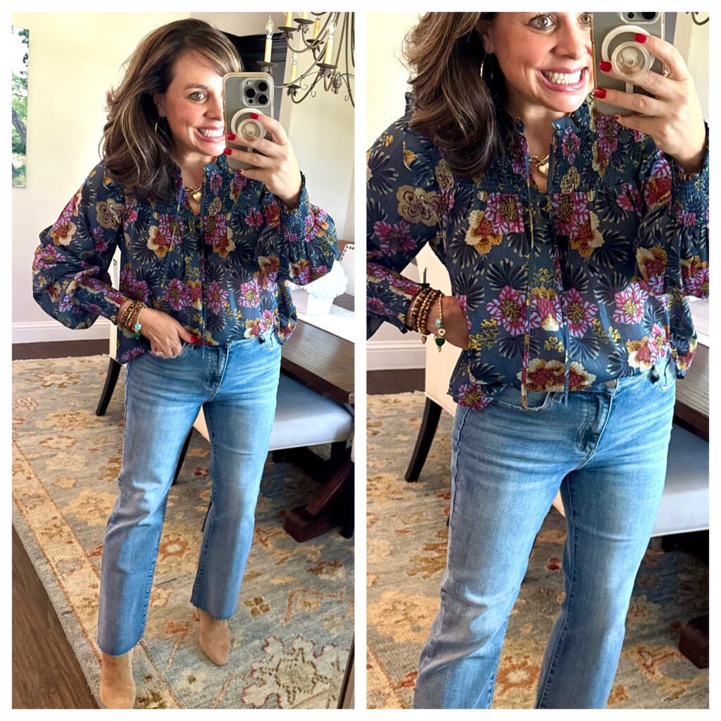 The floral smocked blouse is GORGEOUS. It is sheer throughout the body and sleeves, so I suggest wearing a cami under it. The colors and the details (the smocking, the ruffle cuffs) are absolutely stunning. Head to the website for an up-close look at the details. For size reference, I’m wearing a small in the blouse. (I originally ordered a medium, but there was way too much fabric, so I suggest sizing down).
