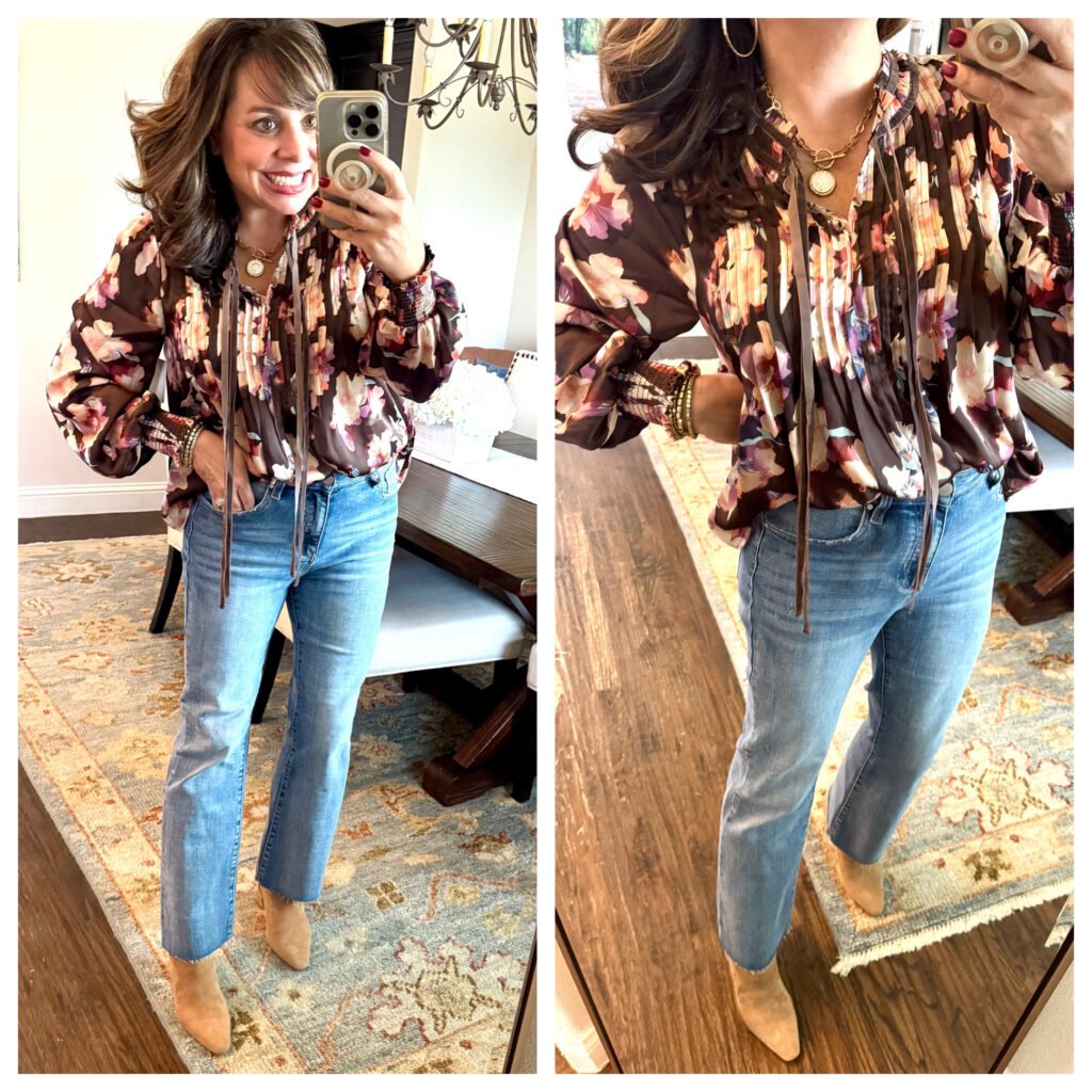 This floral blouse is ohhhhh sooooo fall. The colors are deep and moody, and the floral pattern is lovely. Head to the site and zoom in on the blouse to see all of the pretty details like the pintuck pleats across the front, the tiny ruffled collar, the velvet tie, and the wide elastic cuffs. I’m completely smitten with this blouse. It drapes beautifully and is quite roomy, so you might consider sizing down. For size reference, I’m wearing a medium below, but I think a small might be better.