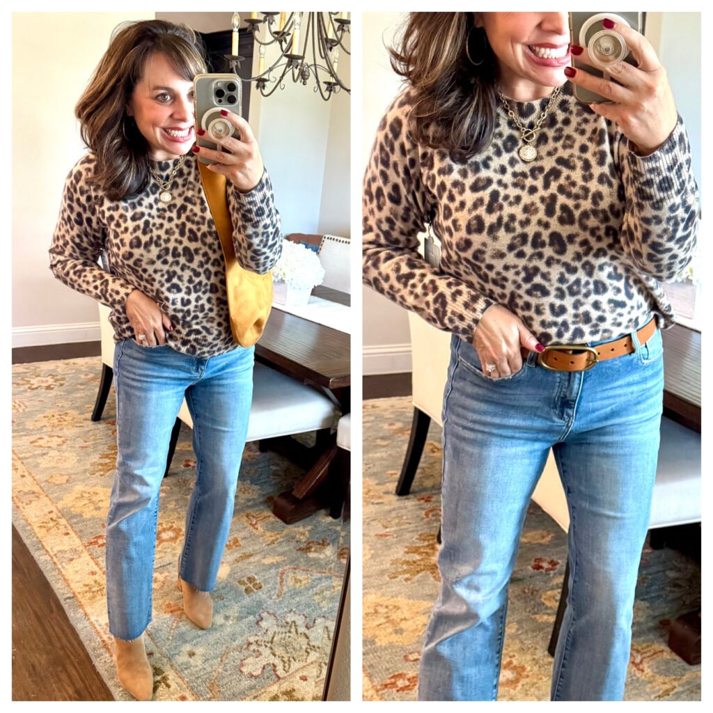 We’ve talked about leopard being big this year. I mean, it’s always been a thing and was never out (I mean! It’s classic!), but it’s really big this year. So what better way to embrace it than with a classic crewneck sweater? This one is lightweight but warm, and it’s crazy soft. The fit is a little bit loose, so I love that it’s not form fitting but not big and boxy either. For size reference, I’m wearing a medium.