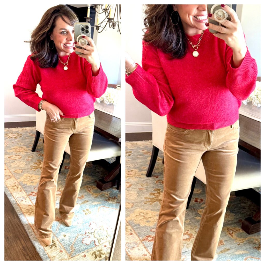 I love that the wine and plum colors are all the rage right now, and this crossover pointelle sweater is just so pretty. This is actually called “beet red”, and it also comes in black, evening blue, and pink smoke. It’s great with a pair of denim, it would be great with a pair of nicer work pants (think black, grey, or neutral), and I think it would also be super cute with a pair of cords. For size reference, I’m wearing a medium.
