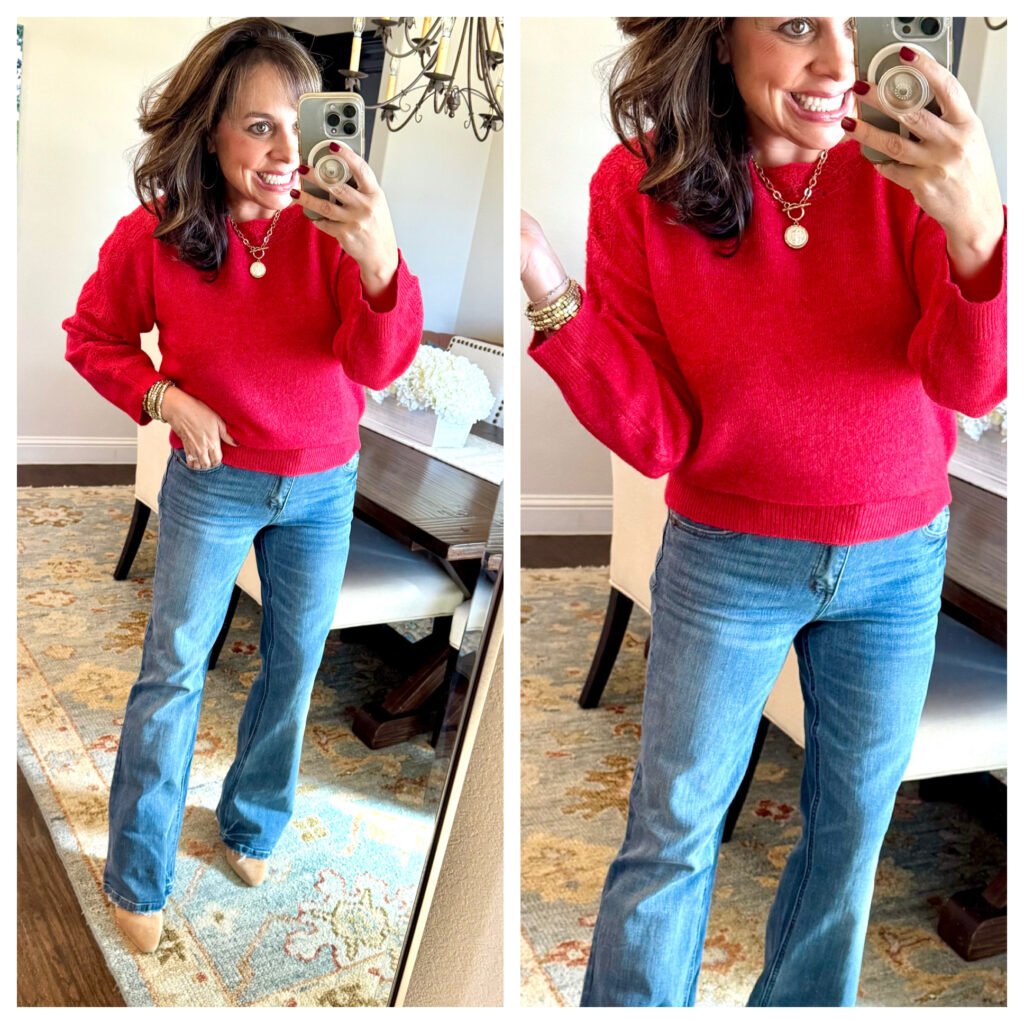 I love that the wine and plum colors are all the rage right now, and this crossover pointelle sweater is just so pretty. This is actually called “beet red”, and it also comes in black, evening blue, and pink smoke. I’ve already shown this sweater with ankle denim, boot cut denim, and pleated black pants and it looks great with all of them. For size reference, I’m wearing a medium in the sweater.