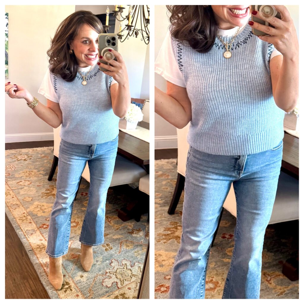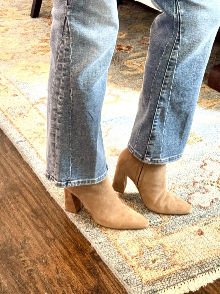 These Aliyah jeans are amazing too. They are stretchy, comfy, flattering as all get out, and what I consider to be a perfect straight leg option. I know that wide leg jeans and barrel jeans are all the rage right now, but I have to say, I still find a nice straight leg jean to be the most figure flattering by far. These are a mid to high rise with a frayed hem. I like the length with these booties, but I might actually cut a bit of length off so they will show a little ankle on me when wearing sneakers or flats. For size reference, I find them to be true to size. I’m wearing a 27.