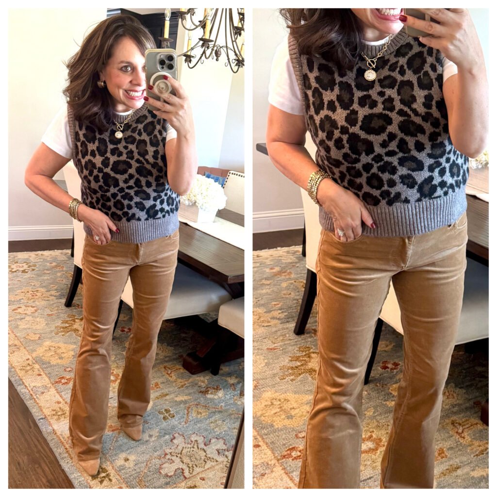 This layered zig zag sweater is super cute! It also comes in a neutral color with an orange zig zag that’s great. Just like the leopard version, the tee is attached to the sweater vest so it creates a clean look, but it can be taken apart by just unbuttoning it. For size reference, I’m wearing a medium. I would say that the vest is definitely fitted, so size up if you want a more oversized look.