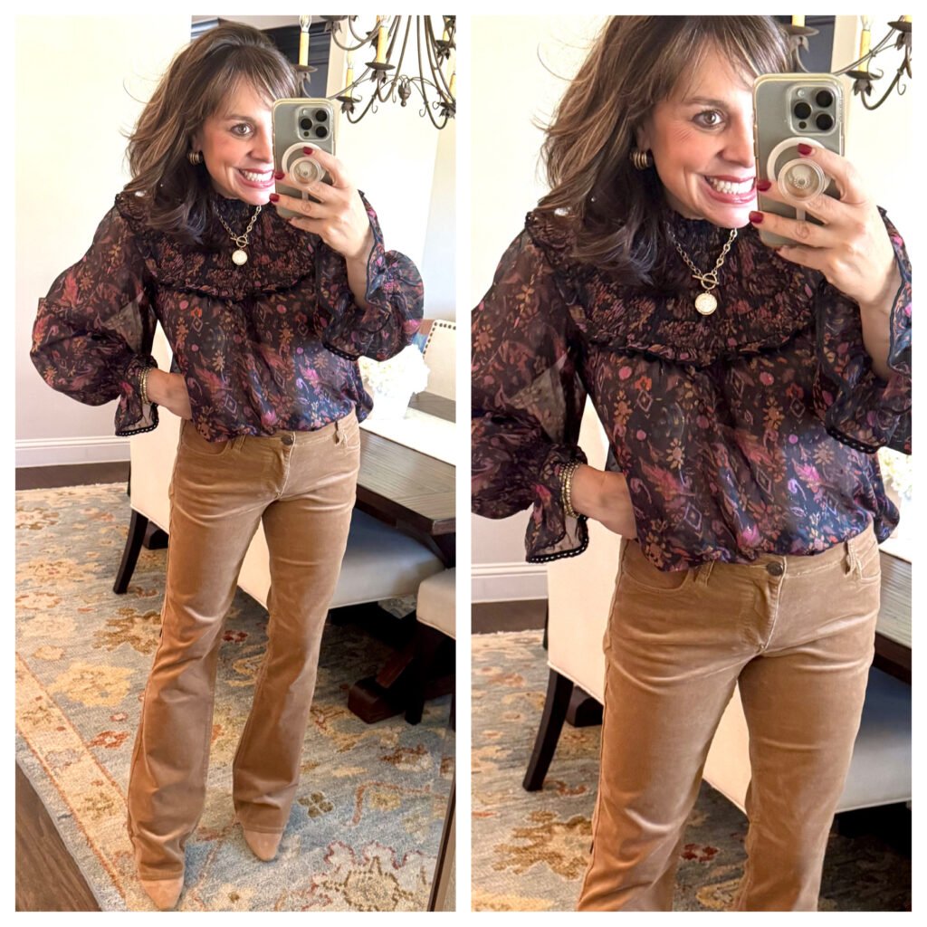 floral blouse / corduroy boot cut / suede booties / hoops / coin toggle necklace / matte gold bracelet stack