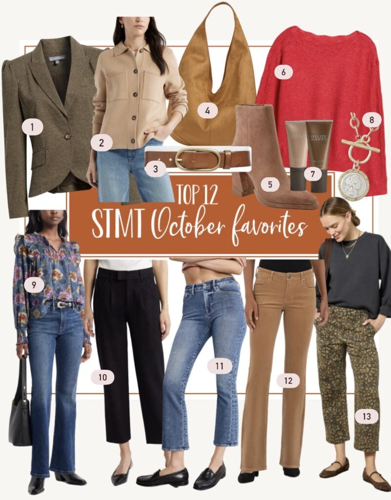 1) puff shoulder blazer / 2) sweater shirt jacket ON SALE / 3) oval buckle belt / 4) faux suede hobo bag / 5) booties / 6) boatneck sweater / 7) Ethereal Glow Serum / 8) coin necklace / 9) smocked yoke blouse / 10) pleated dress pants / 11) crop boot cut jeans / 12) boot cut cords / 13) leopard barrel pants
