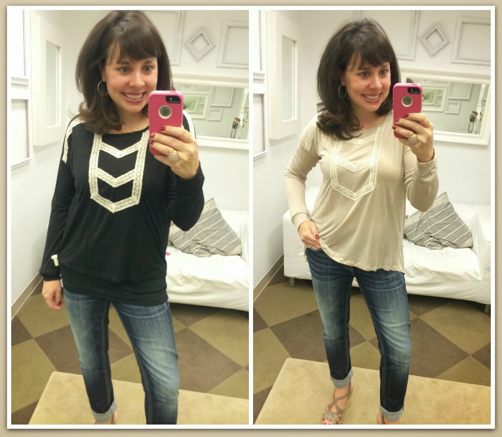 I really liked this shirt in both colors. Both were a small, but for some reason the black one was shorter than the cream one. (Make sure you look closely and see how I’m wearing a black tank under the black one it to give it the look that I wanted.)