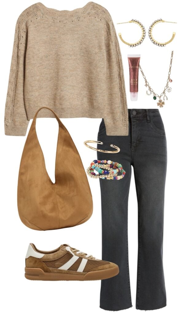 neutral sweater / faded black jeans / suede hobo bag / sneakers / beaded hoop earrings / charm necklace / lip gloss / bracelet trio / gold bracelet
