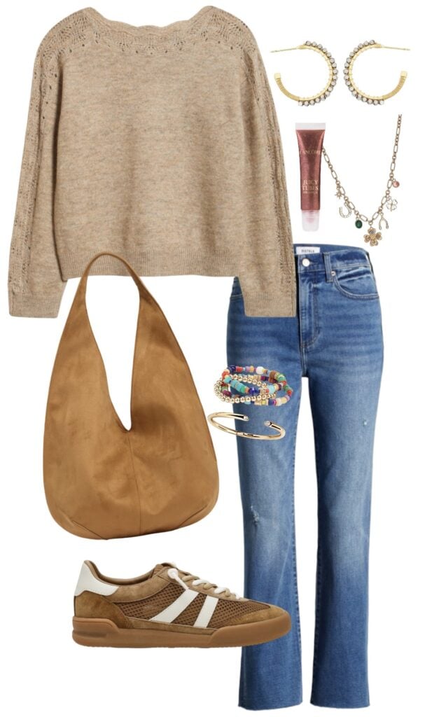 neutral sweater / must have straight leg ankle jeans / suede hobo bag / sneakers / beaded hoop earrings / charm necklace / lip gloss / bracelet trio / gold bracelet