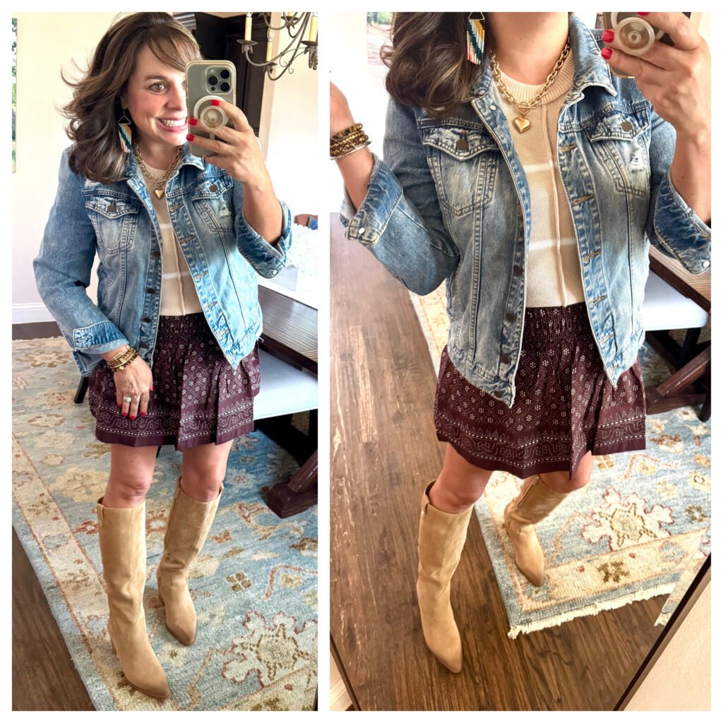 Here I have it styled with just a regular white v-neck and denim jacket. It would look amazing with cowboy boots, and this is an outfit I would totally wear to a concert (although I’d also wear to just a regular ol’ dinner out)! For size reference, I’m wearing a medium. It is quite short, so if you’re tall, it might not work for you.