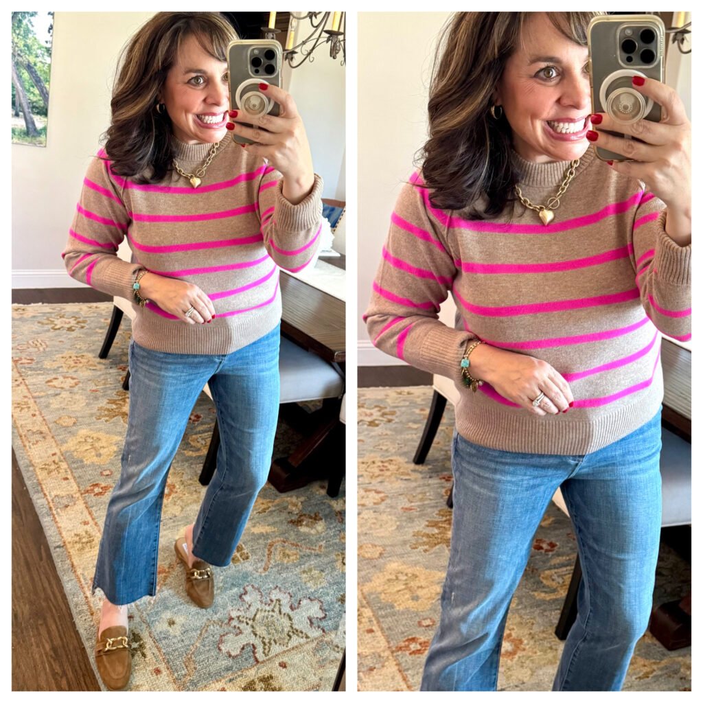 And just for a little bit different of a look, here I’ve paired it with a neutral striped short sleeved sweater.