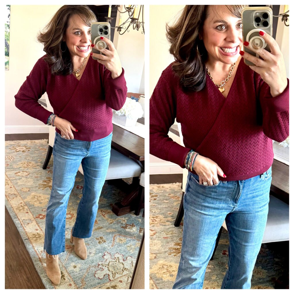 I love that the wine and plum colors are all the rage right now, and this crossover pointelle sweater is just so pretty. This is actually called “beet red”, and it also comes in black, evening blue, and pink smoke. It’s great with a pair of denim, it would be great with a pair of nicer work pants (think black, grey, or neutral), and I think it would also be super cute with a pair of cords (like these ankle flare cords or these bootcut cords). For size reference, I’m wearing a medium in the sweater.
