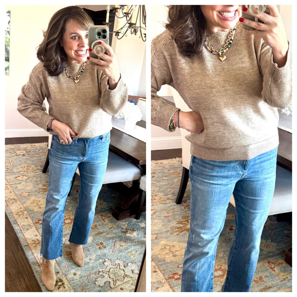 This boat neck sweater surprised me in all the best ways. I’m wearing the “heather oatmeal” here, and it really is a perfect neutral. But if you don’t need a neutral, there are 8 other gorgeous colors to choose from. The scallops on the neckline are beautiful, and the detail all the way down the top of the sleeves is really lovely.