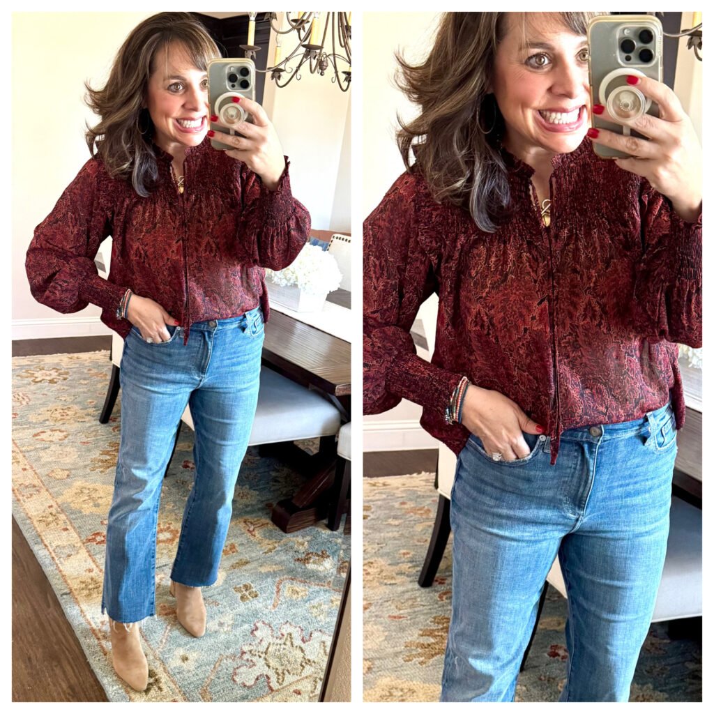 This smocked yoke blouse is GORGEOUS. I love it with this regular denim, I’ll love it with black denim, and you’ll definitely be able to style it for the office as well. And get this! You also have the option to grab a matching skirt. It’s not a look that I’m sure if I could pull off or not, but I do like it!