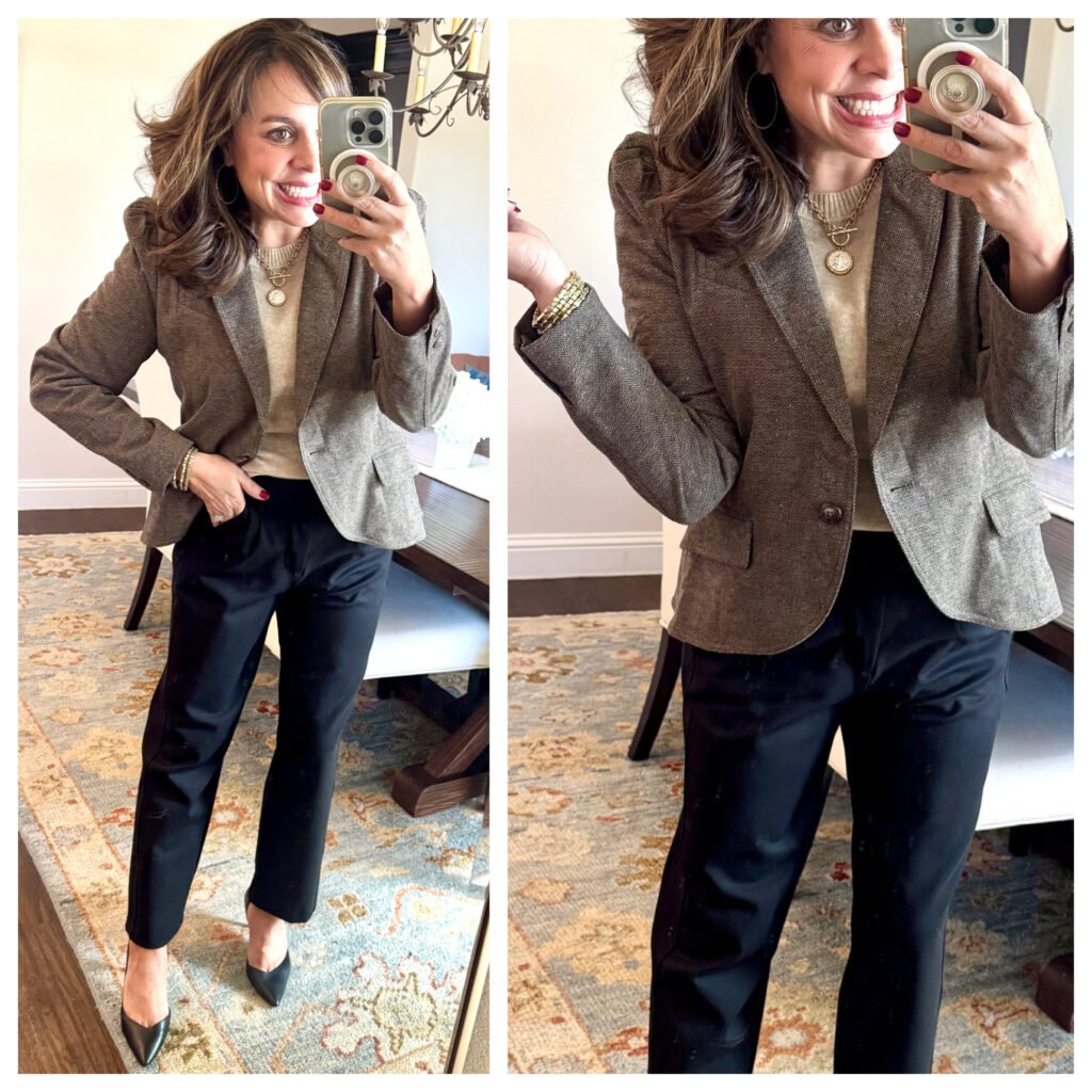 Everybody needs a classic black blazer that they love in their closet (I own this one and LOVE IT), but this brown herringbone one would be a nice addition too. It’s tailored with 1 button, tiny puff shoulders, and a rounded hem. I absolutely love the feminine fit. It’s girly and quite flattering. For size reference, I’m wearing a medium.
