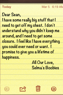 I'm with you…Sean's "find the laughter" statement was the hugest one of the night taking a backseat only to Tierra's "people light up when I enter the room". Gag me with a spoon. And Ashlee…whoa. Her interview had MY gonads tucked up tightly in my stomach and I don't, well…you know. Anyhoo, I think you might be right about that letter. Although I'm surprised it's taken this long for Selma's mams to speak up. 🙂
