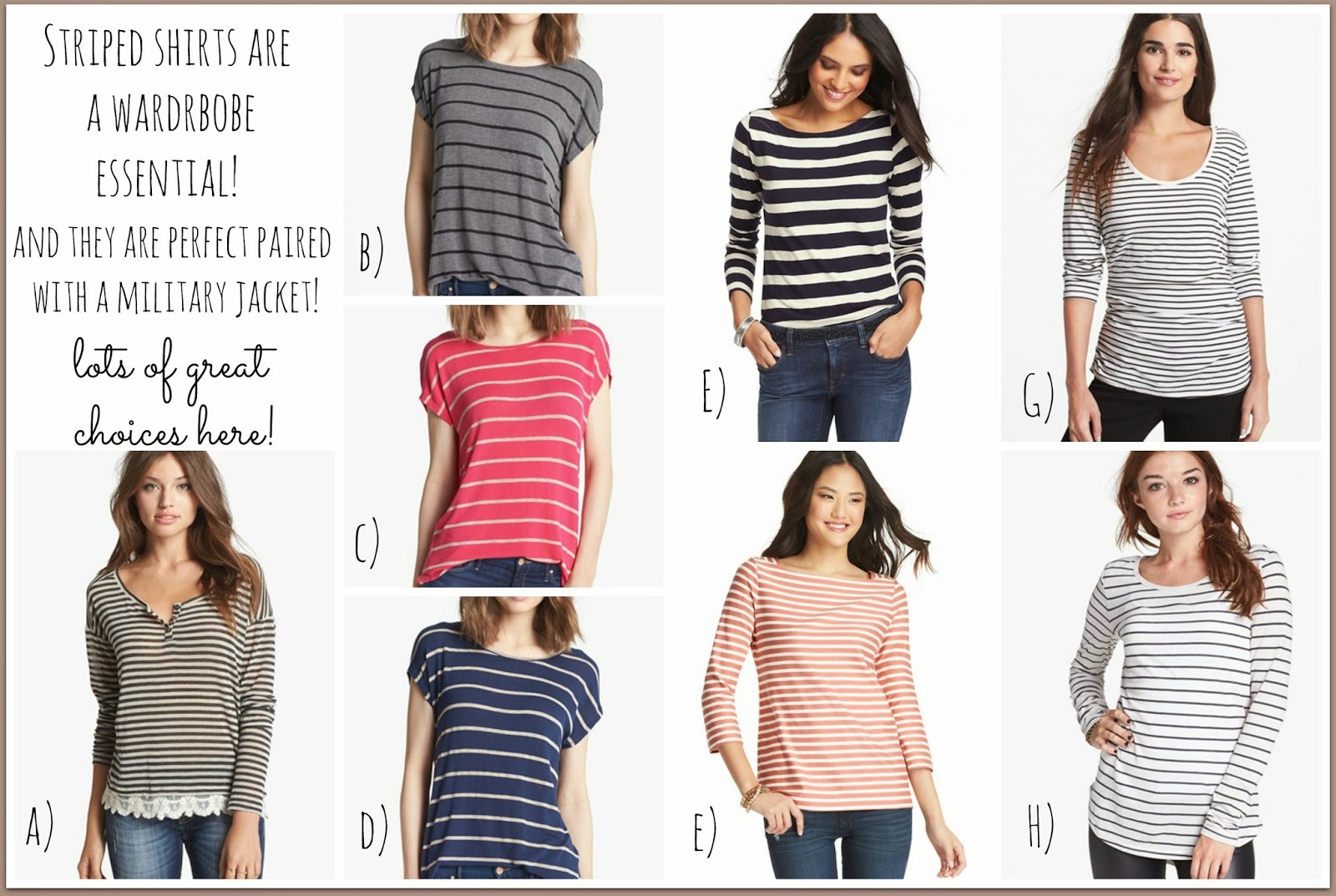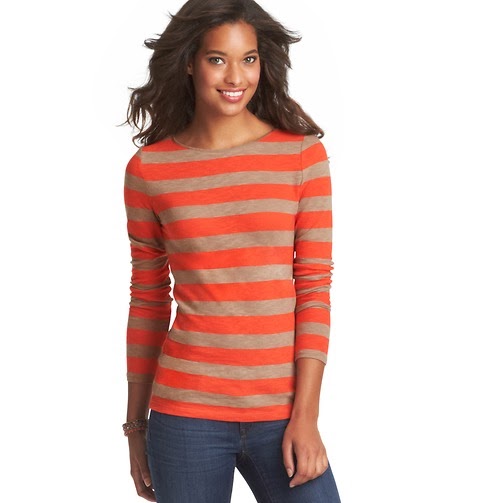 Here is another striped tee that I just tried on yesterday at White House Black Market: http://www.whitehouseblackmarket.com/store/browse/product.jsp?productId=570091533&prd=Shimmer%20Stripe%20Long%20Sleeve%20Tee The fabric is wonderfully soft, and I love the extra details on the sleeve and shoulder, plus the subtle sparkle. This would be so cute under a military jacket. The ladies at the store told me everything will be 40% off on Black Friday, so I'm waiting until then.