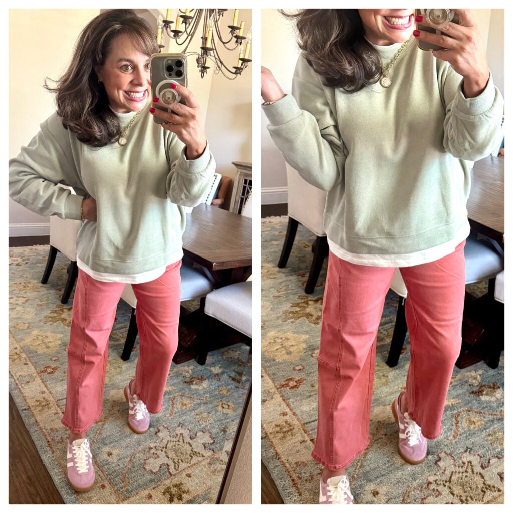 This layered crew pullover is also not fully stocked in this pale green and in a pale pink as well! This has become a staple in my closet. I’ve worn it at least 8x since getting it. The sweatshirt is super soft and comfy, and the little crewneck that is peeking out from the neck and the hem really elevate this sweatshirt and will instantly help you look pulled together. I’m in a medium, and it’s a perfectly relaxed fit and roomy fit. A small would definitely fit, but I like the oversized look of the medium. If you don’t want it quite so oversized, size down. It has 31 reviews, and almost every single one of them is 5 STARS.