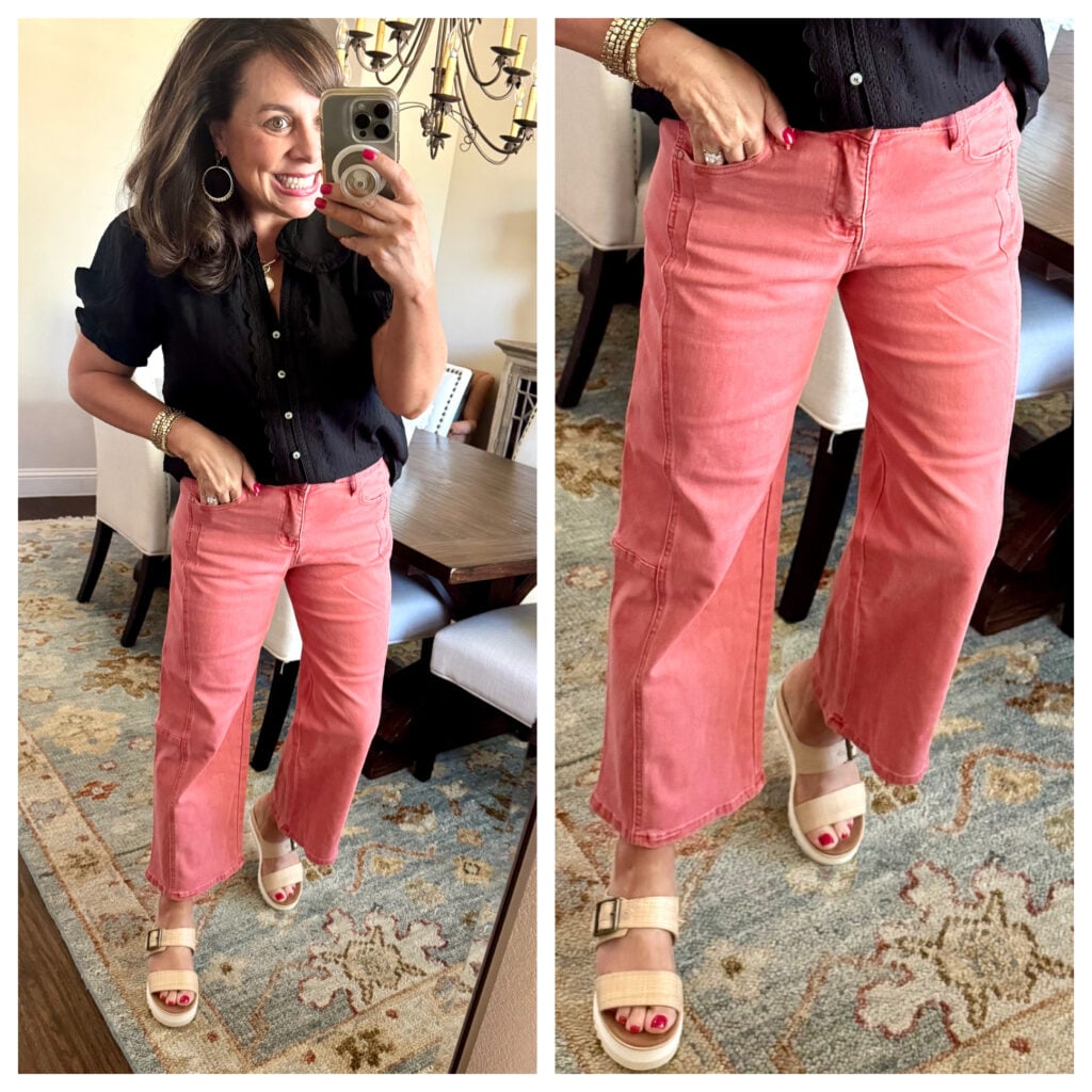 Here’s the jeans styled one more time, because whenever I highlight a pair of colored pants, I always get questions about styling ideas.