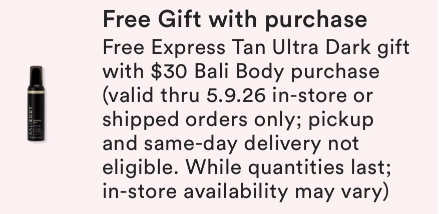 And check this out! There’s a FREE GIFT WITH PURCHASE RIGHT NOW with any $30 Bali Body purchase! I can’t find anywhere what size the free gift is, but I’m still excited to receive it. I think it might even be full-size!?!