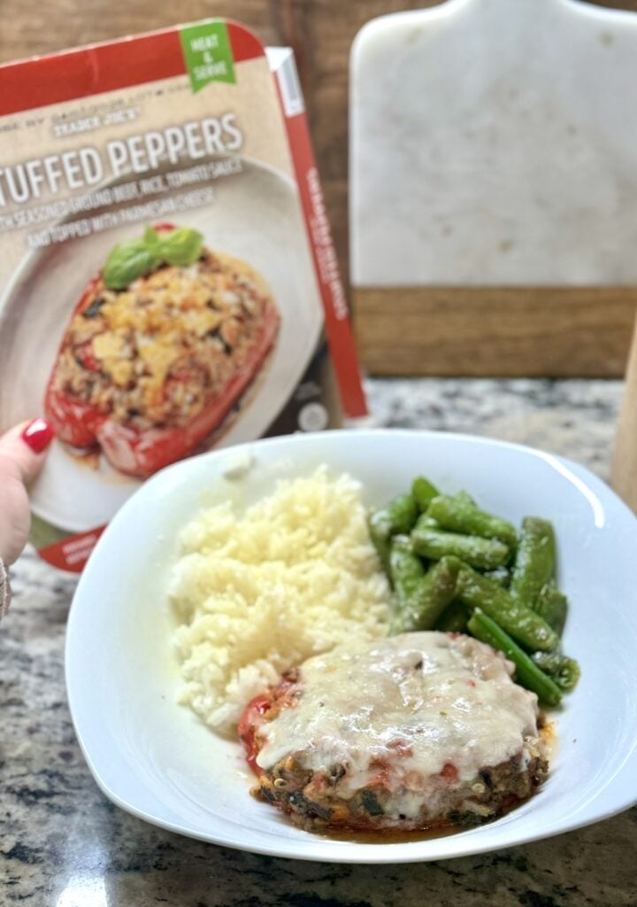 I found these stuffed peppers at Trader Joe’s and decided to give them a shot. I seriously cannot believe how delicious they are. You can find them in the refrigerated section by the enchiladas, lasagna, and other prepared meals like that. Two peppers come in the package. I like pairing mine with rice and sugar snap peas. Oh, and they come topped with cheese, but I put a little extra pepper jack cheese on top.