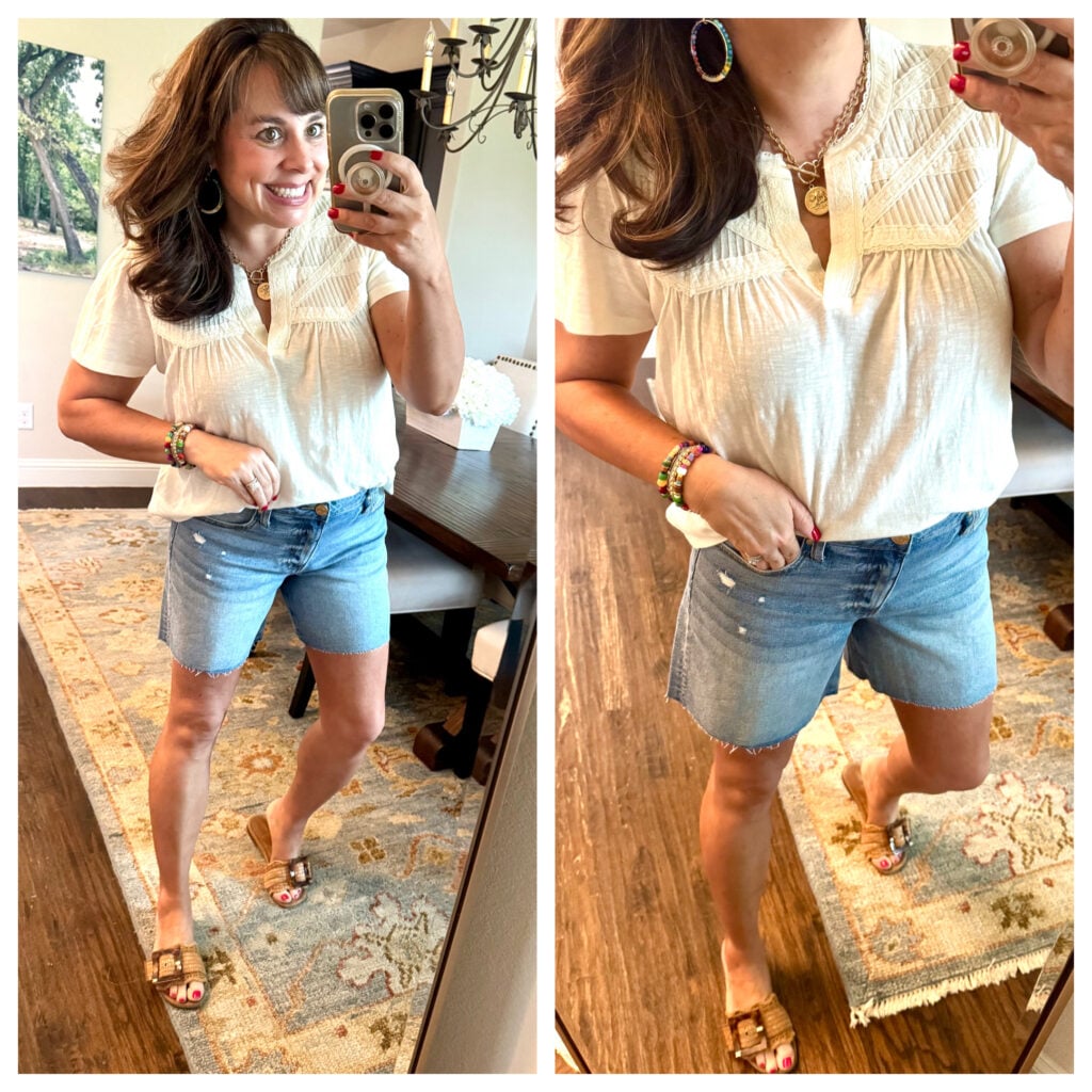 lace pintuck top / denim shorts / multicolor earrings / coin toggle necklace / gold bracelet stack / multicolor bracelet set / raffia buckle sandals