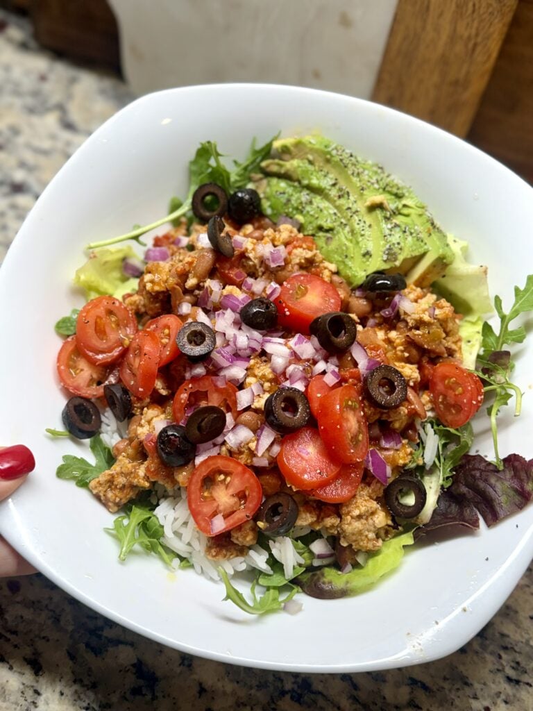 So let’s talk about my chicken taco mixture. I make it every 2 weeks or so, and then I eat on it for several meals. I make nachos, tacos, and the below taco salad. The mixture is simple: 1 pound ground chicken (or turkey), 1 chicken taco seasoning packet, 1 can of ranch style beans (semi-drained), 1 can of Rotel (fully drained). That’s it! Flavorful, filling, and I love that I can just keep grabbing it throughout the week.